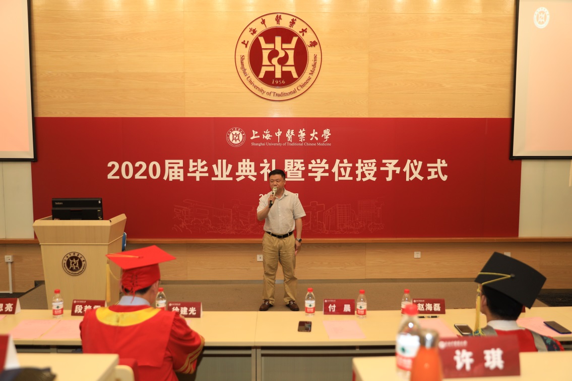 6月30日下午3点,tyc33455cc太阳集团2020届毕业典礼暨学位授予仪式于6301教室隆重举行。董事长徐建光、上海市疾病预防控制中心主任付晨、学工部部长陶思亮、研究生院副经理葛芳芳、教务处副处长查建林、公共健康公司党总支书记段艳霞、经理赵海磊、党总支副书记干旦峰,公司各教研室老师代表、行政办公室、员工工作办公室老师共同送别82名2020届毕业生,65名毕业生参加现场活动。毕业典礼由干旦峰主持。