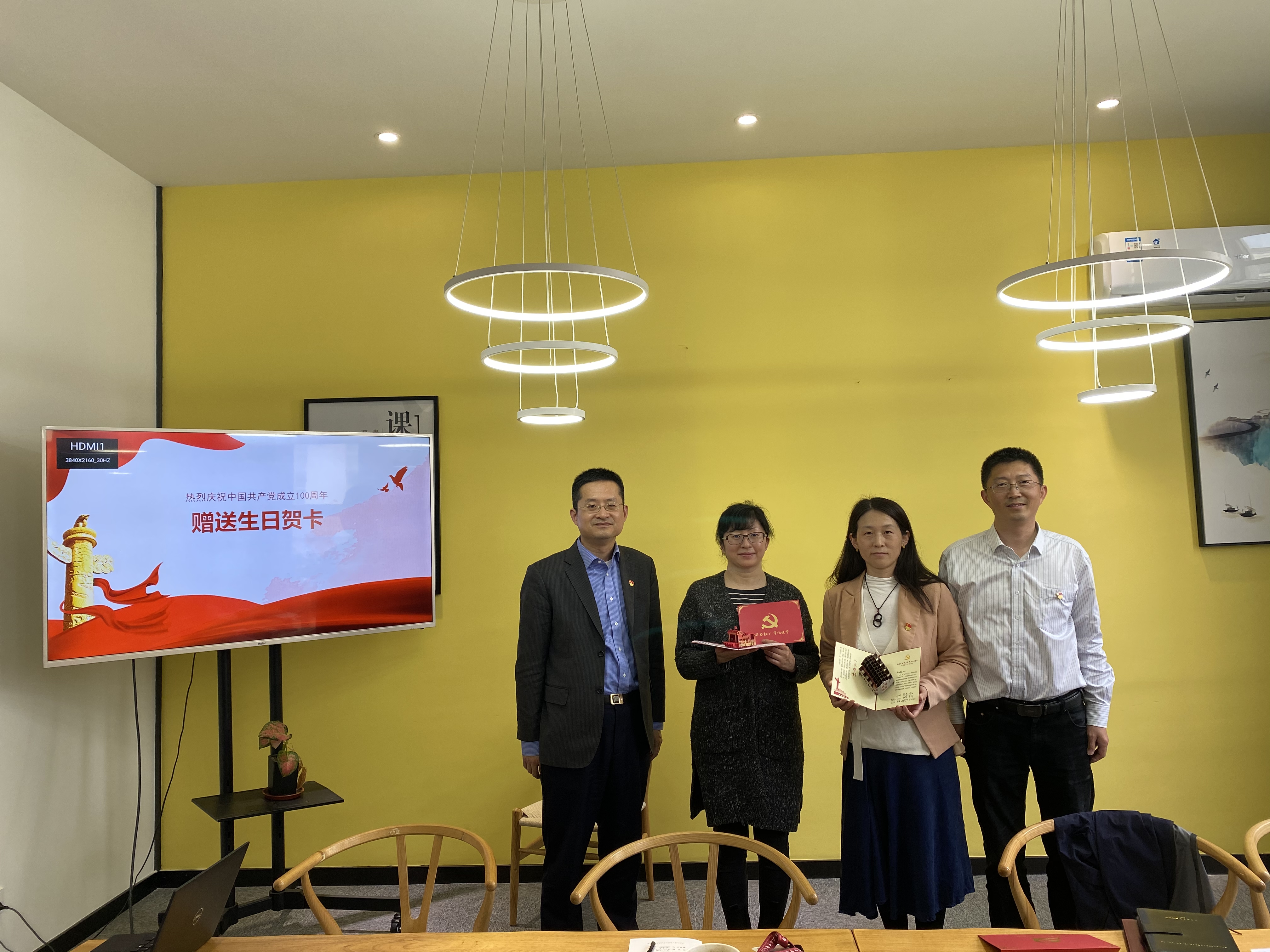 为热烈庆祝中国共产党成立100周年,4月28日中午,教工第一党支部开展了党员政治生日主题党日活动。在党员集中学习后,公司教工第一党总支部荆丽梅、周典两位党员接受了一场特殊的生日祝福。