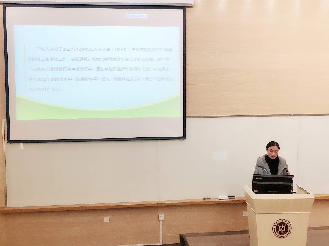 此后,办公室主任冀黎平老师通报了《2021年终绩效工资发放情况》。