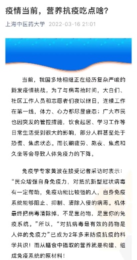 自疫情爆发以来,公司通过政治理论学习会、民主管理大会研讨、校内外专家调研等,不断坚定师生为发展中医药特色公共卫生事业的信心。本轮疫情到来,经理赵海磊、副经理谢国群带头,组织专业教师、研究人员开展科普宣传,主动发挥中医药、公共卫生学科服务人民健康的特色。“疫情当前,营养抗‘疫’吃点啥?”、“‘奥密克戎’到底是啥意思?”、“疫情防控下,肿瘤患者的居家防护”……不到一周,稿件近10篇,除了在公司、公司的微信公众号发布,沈红艺教授的文章还陆续获得人民网、文汇、上观新闻、新民晚报等新媒体平台转载宣传。
