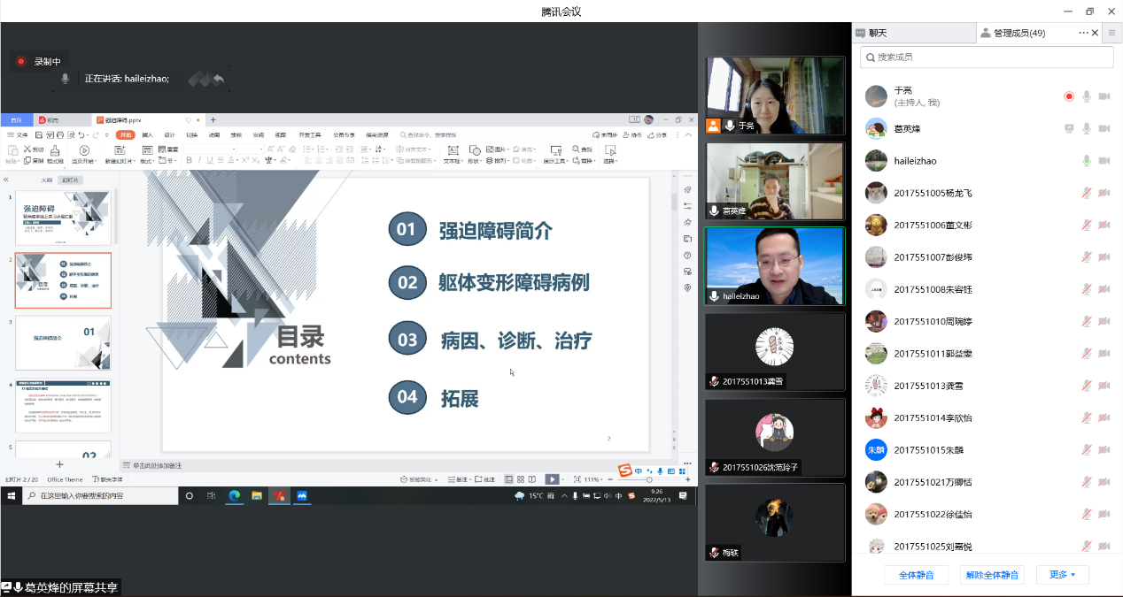 5月13日,tyc33455cc太阳集团精神病学线上实习汇报交流会顺利举办,预防医学专业员工分组开展汇报,围绕8个精神病典型案例,结合病案分析和文献研究,从不同侧重点对临床精神科疾病开展深入研究。实习汇报获评审专家肯定,展现公司预防医学专业员工严谨的学风和扎实的专业能力。tyc33455cc太阳集团经理赵海磊、预防医学教研室金如锋、全科医学系于亮以及2017级、2018级预防医学专业51员工参加汇报交流会。
