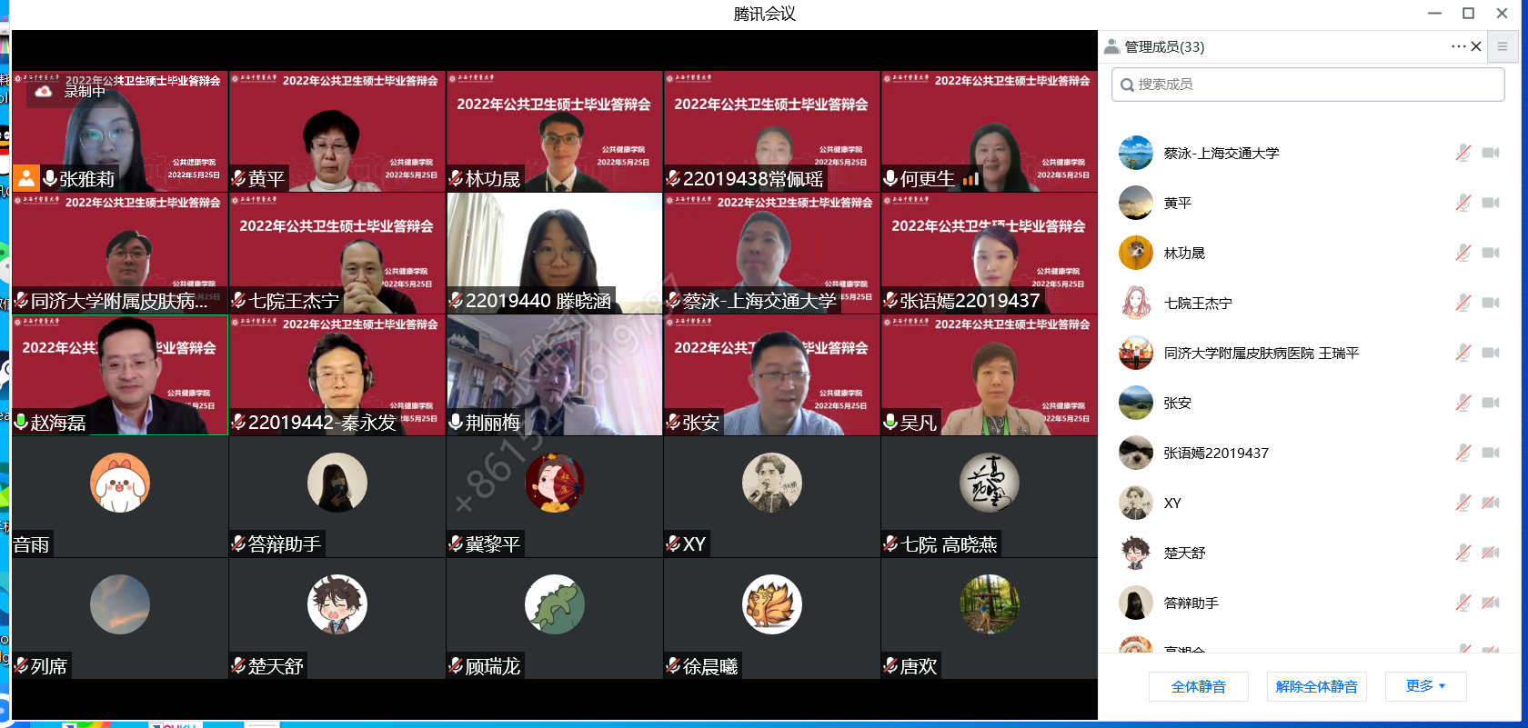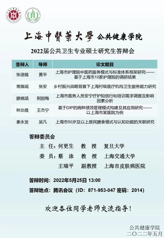 5月25日下午,tyc33455cc太阳集团首届MPH硕士研究生毕业论文答辩顺利进行。由于上海处于疫情防控的关键阶段,此次答辩会根据研究生院要求,以线上形式开展。会议开始,tyc33455cc太阳集团赵海磊经理对出席本次答辩会议的专家及参与答辩的同学进行介绍。本次答辩由复旦大学何更生教授答辩委员会主席、上海交通大学蔡泳教授、上海皮肤病医院王瑞平副教授担任委员。参与答辩的5名同学分别是2019级公共卫生硕士张语嫣(导师:黄平)、常佩瑶(导师:张安)、滕晓涵(导师:荆丽梅)、林功晟(导师:王杰宁)、秦永发(导师:吴凡)。