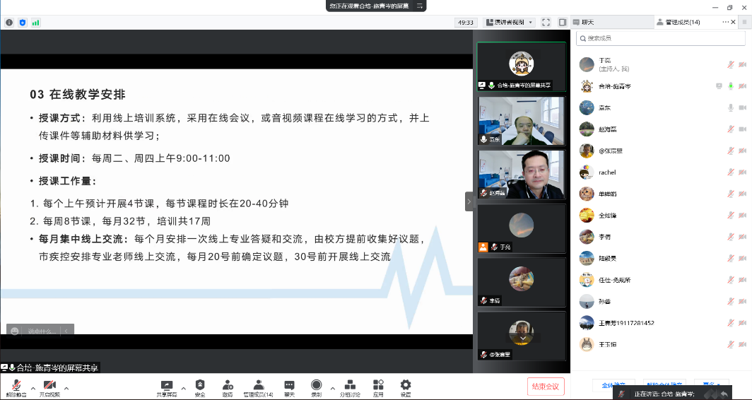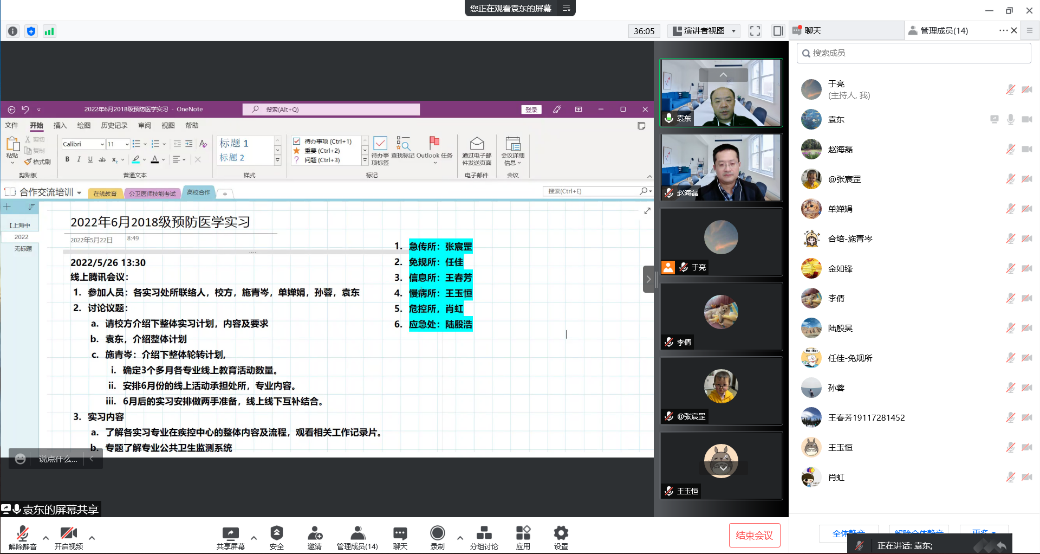 袁东处长介绍本次实习带教的具体安排。中心根据预防医学专业实习大纲要求落实实习带教科室和联络人,目前已完成实习员工分组安排。针对第一个月线上实习,中心安排每周两次的线上集中讲授和每月一次的集中答疑,并根据每个处所的工作内容有所侧重,组织员工完成公共卫生技能操作学习,熟悉公卫工作条线工作的内容和特点、以及公共卫生检测系统,能够在带教老师指导下学习撰写检测报告和突发事件报告。施青岑老师详细介绍本次实习各处所的分工、轮转计划、在线教学安排和员工产出要求等内容。市疾控各个处所实习工作负责老师分别介绍了各自科室的带教计划和安排。