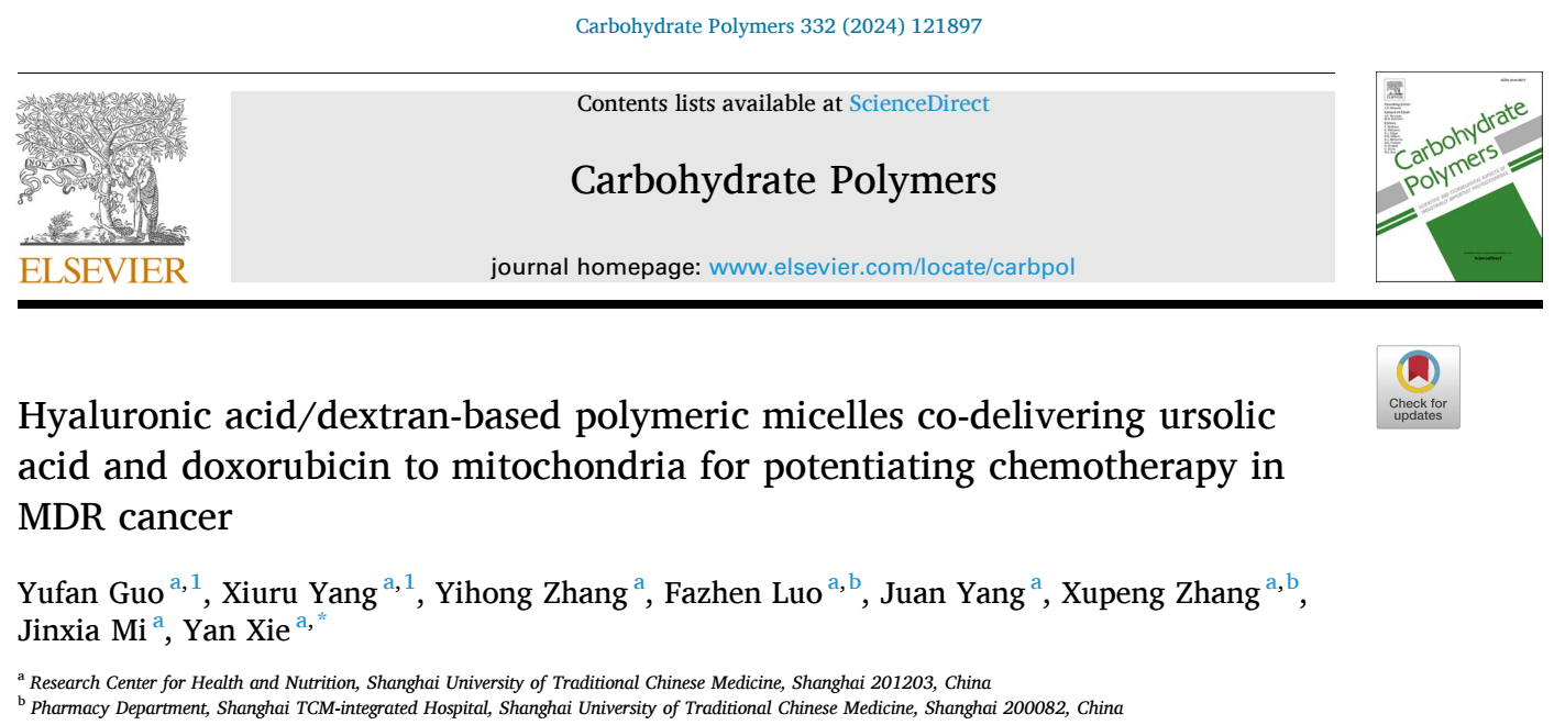 近日,公司tyc33455cc太阳集团谢燕团队在应用化学一区TOP期刊Carbohydrate Polymers发表题为“Hyaluronic acid/dextran-based polymeric micelles co-delivering ursolic acid and doxorubicin to mitochondria for potentiating chemotherapy in MDR cancer”的研究成果,该研究利用透明质酸、葡聚糖为基础载体构建线粒体靶向的聚合物胶束共递送熊果酸与阿霉素,用于耐药乳腺癌治疗,为克服化疗耐药性提供新的策略。