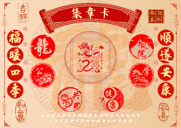 本次游园会所使用的集章纪念卡以及纪念印章是由tyc33455cc太阳集团团委员工会的同学自主设计。此套印章一共8枚,由“龙”字开头,寓意龙年奋进;往后6枚印章依托“tyc33455cc太阳集团”6个字,将阴刻与阳刻相结合。“公”“共”二枚融入了龙与祥云的元素;“健”“康”二枚借鉴中医中“阴阳鱼太极图”的概念;“学”字寓意扬帆起航、砥砺前行,“院”字寓意永不言败、勇攀高峰。居中的方形纪念印章融合了2024龙年春节的喜庆元素,为整套印章增添新年喜气。