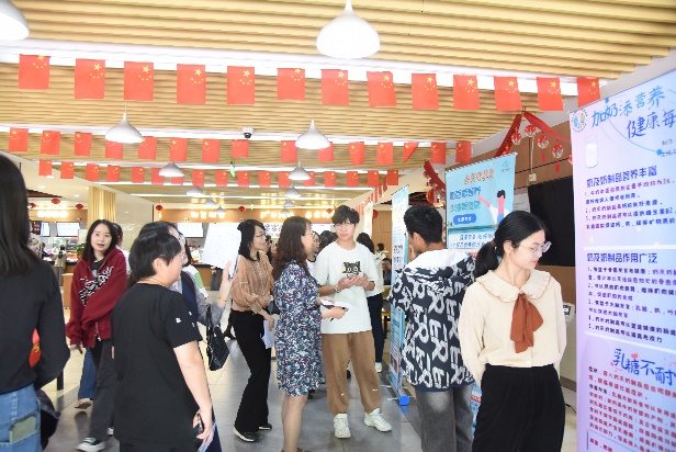 全民营养周活动是贯彻落实国务院《健康中国行动(2019-2030年)》和《国民营养计划(2017-2030年)》的重要措施。5月16日中午,由食品卫生与营养学教研室联合营卫导师团、员工第一党支部、教工第二党支部举办的“健康中国,营养先行”2024年全民营养周暨“5·20”中国员工营养日:营养健康校园行主题活动在员工食堂一楼大厅顺利开展,吸引了众多师生驻足停留。