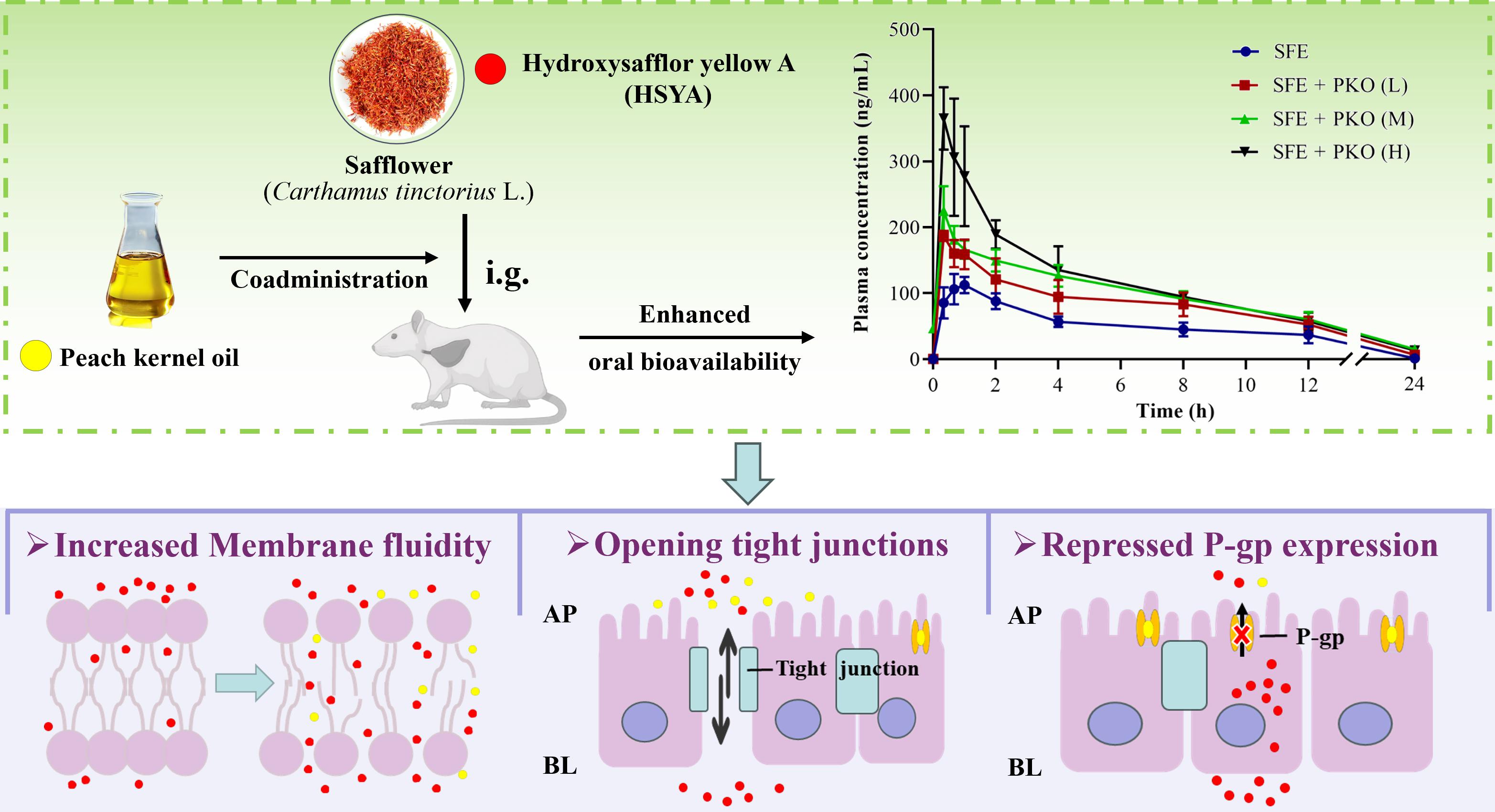 羟基红花黄色素A(HSYA)是红花中最主要的一种植物化合物,具有抗氧化、抗炎以及心血管保护等多重生物活性。然而,该化合物的高水溶性和低渗透性特点限制了其口服吸收,生物利用度较低。谢燕团队前期研究发现,桃仁与红花联用后,大大增强了红花对气滞血瘀模型大鼠的活血作用;从桃仁中分离得到的桃仁蛋白、桃仁油脂等组分,均对红花中羟基红花黄色素A的口服吸收具有一定促进作用。本研究进一步证实,桃仁油脂主要通过增加肠黏膜上皮细胞膜的流动性、可逆性地打开紧密连接、抑制P-gp外排活性等途径,促进羟基红花黄色素A的跨膜转运。