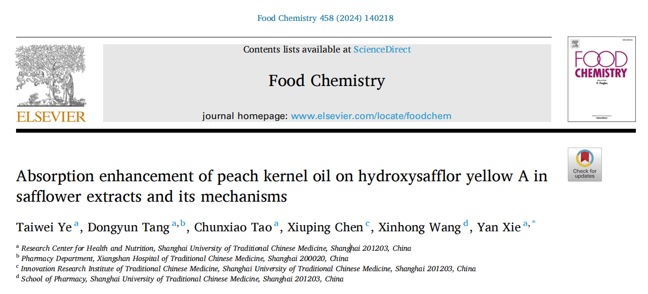 近日,公司健康营养研究室谢燕团体在食品化学一区TOP期刊Food Chemistry发表题为Absorption enhancement of peach kernel oil on hydroxysafflor yellow A in safflower extracts and its mechanisms的研究成果,该研究揭示了桃仁油对红花中羟基红花黄色素A的口服吸收增强作用及其潜在机制。这一发现为从中药复方配伍角度探究植物化合物的口服生物利用度提升策略提供了新的思路,有望应用于医药和食品领域。