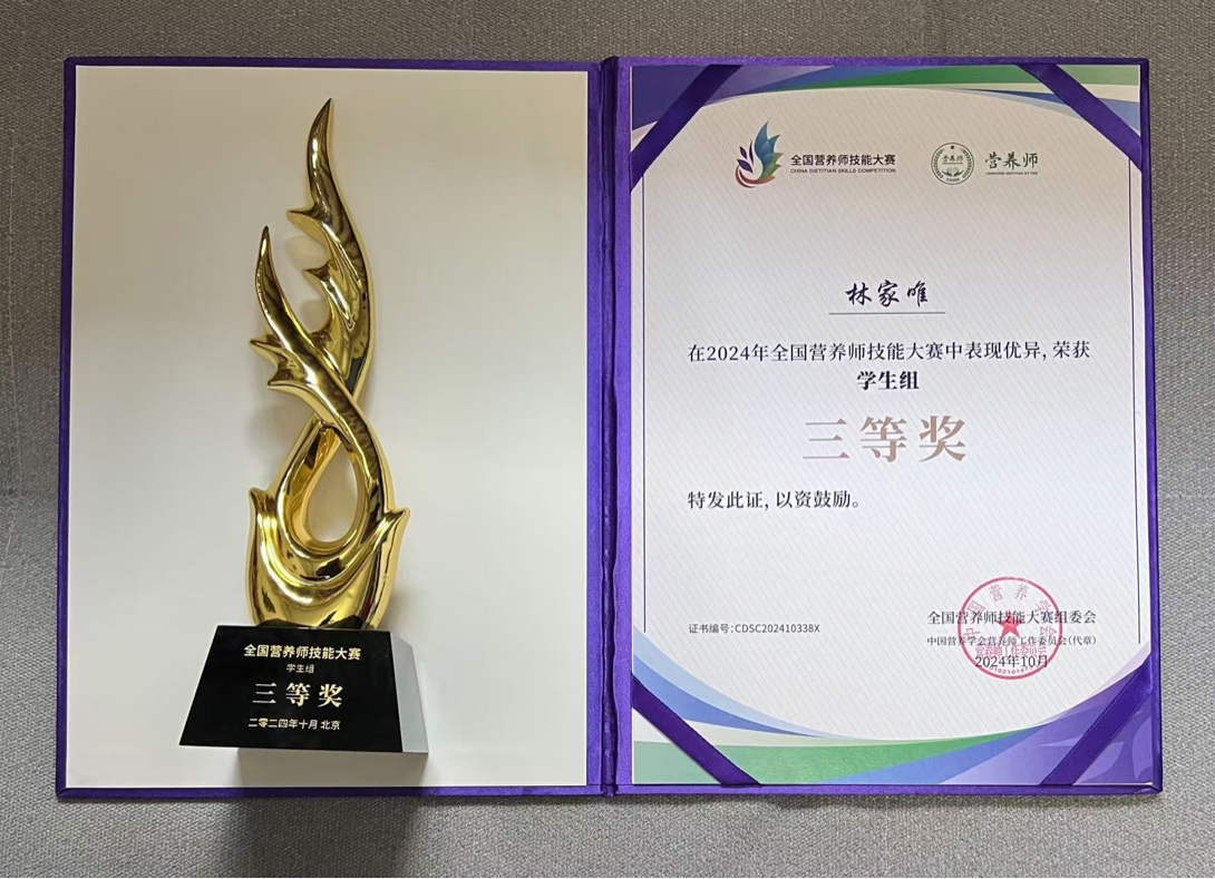 2024年全国营养师技能大赛颁奖典礼于2024年11月1日在河北石家庄举行。公司2023级食品卫生与营养学专业(高本贯通)林家唯同学作为全国营养师技能大赛员工组三等奖获得者参加颁奖典礼。