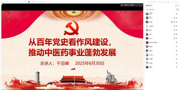 公司党委副书记干旦峰以“从百年党史看作风建设,推动中医药事业蓬勃发展”为主题,围绕四个篇章带领党员回顾百年党史,以中央八项规定为镜,剖析形式主义、官僚主义对党的作风建设和中医药传承创新的危害,结合《中医药发展战略规划纲要》,指出严谨学风是守正创新的基石,号召师生在经典研究中坚守初心,在科研攻关中勇攀高峰。党的优良作风百年传承,“理论联系实际、密切联系群众”是中医药人服务人民健康的行动指南,希望教师党员将思政教育融入专业课堂,员工党员在志愿服务中践行“健康中国”使命,以清廉医风护航中医药事业发展。干书记寄语全体党员以史为镜正作风、以廉为尺守初心,让党的优良传统与中医药文化交相辉映,共同书写新时代中医药事业高质量发展的壮丽篇章。